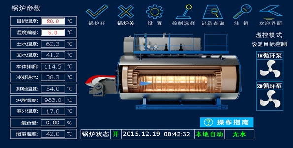安装后不必由质量技术监督行政部门锅炉压力容器安全监察机构进行确认,也不必办理使用登记注册手续;安装位置可在地下室、楼顶等场所。 | 标配PLC控制系统和5.7寸触摸屏人机界面,实时动态显示锅炉运行画面和相关参数,直观便捷;触摸屏直接显示炉内热媒水温度、真空度、换热器进出口水温等众多运行参数、故障记录和运行曲线等,使操作变得简便和严谨。 | ||